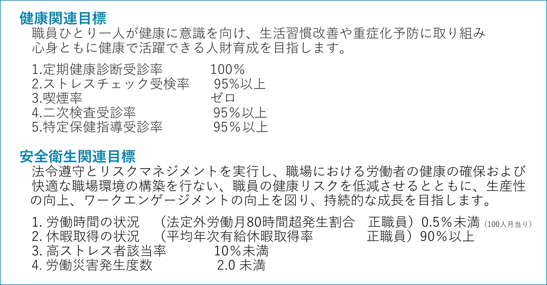 健康診断事業を展開し、お客様がより健康な毎日を活き活きと過ごすお手伝いをさせていただいている企業として、自社が健康経営に取り組み実践し成果を出していく事でお客様によりよい健康診断事業をご提供出来るという理念・目的の下、経営層が主体となり健康経営の実践に取り組んでまいります。